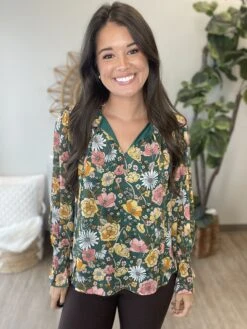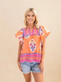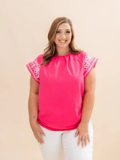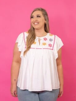Floral Embroidered Flutter Sleeve Pleated Neck Blouse | S-XL