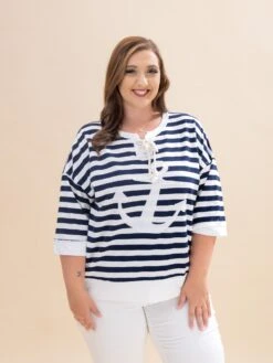 Marine Striped Short Sleeve Pullover With Anchor Graphic Top| S-3XL