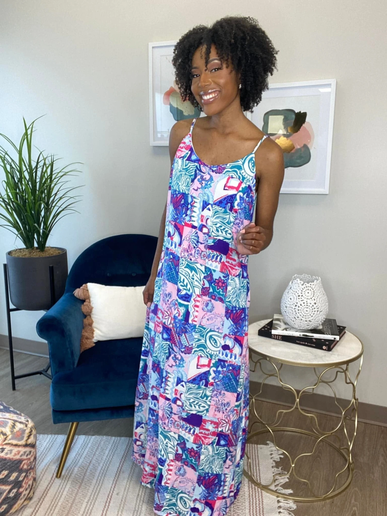 The “Travel Around Dress” has arrived! This patch-printed dress is so stylish! An absolute must have, you do not want to miss out on this one! Snag this spaghetti strap maxi dress before they sell out!