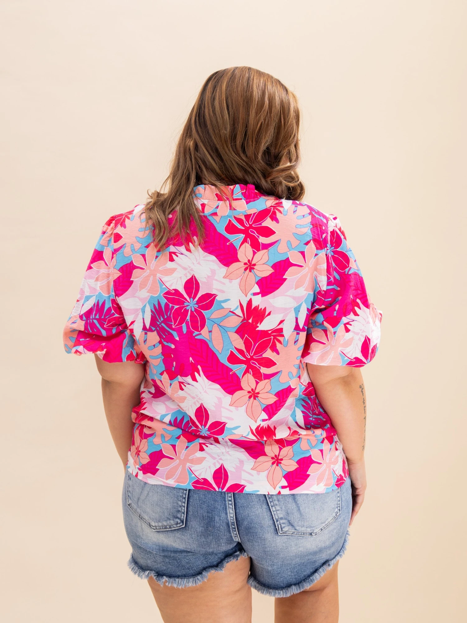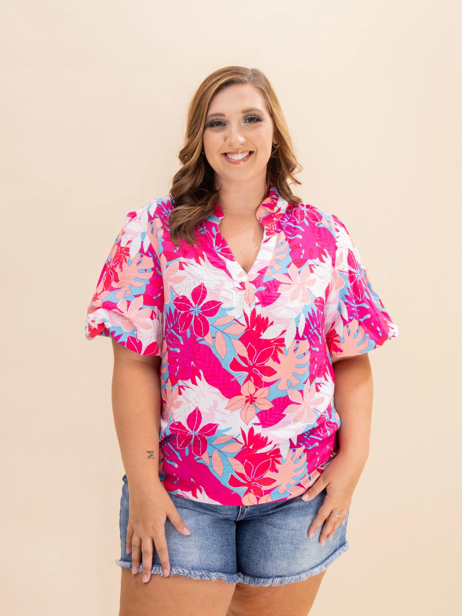 Features:V Neck, Puff Sleeves, Tropical Plant Printed