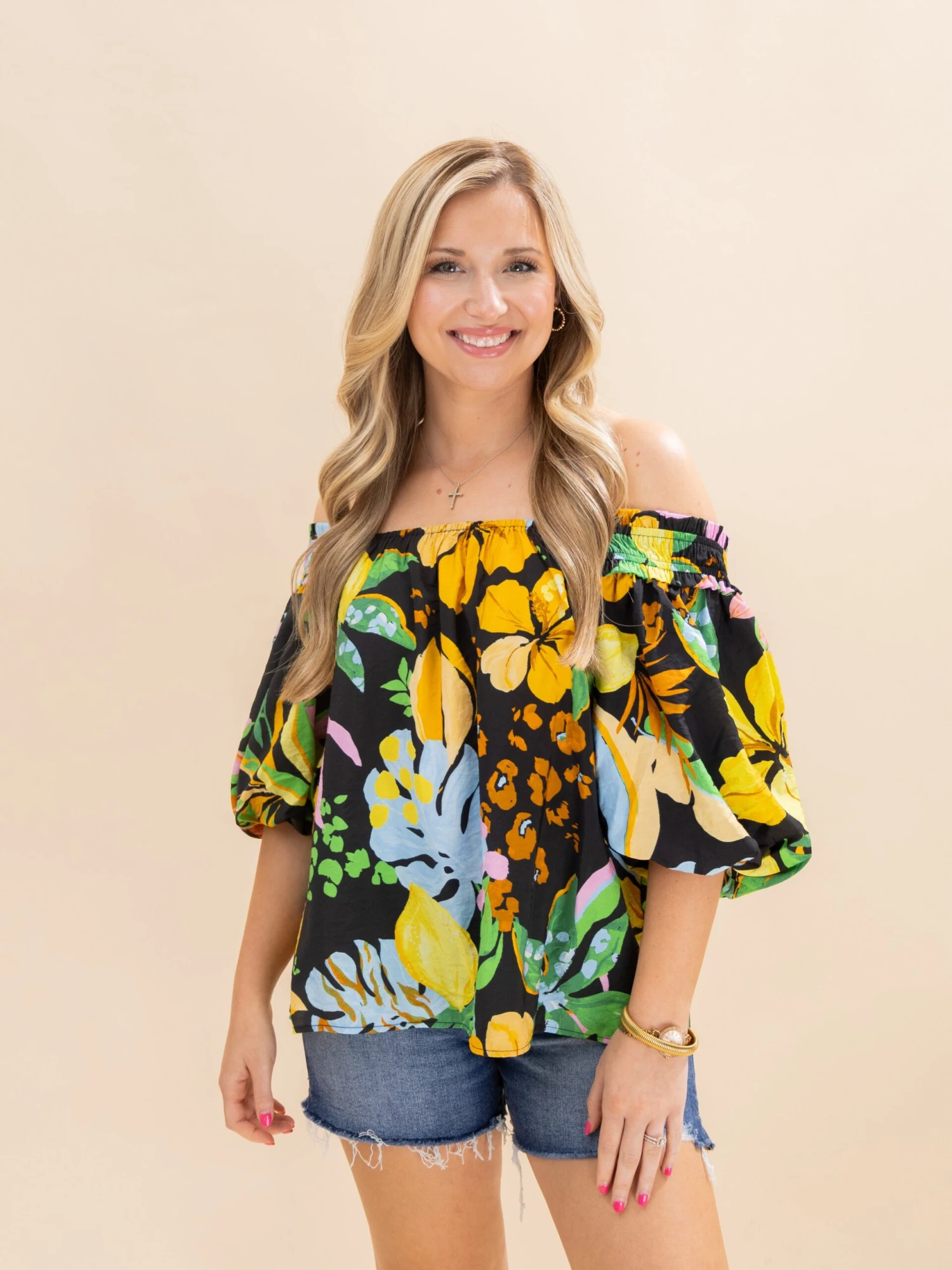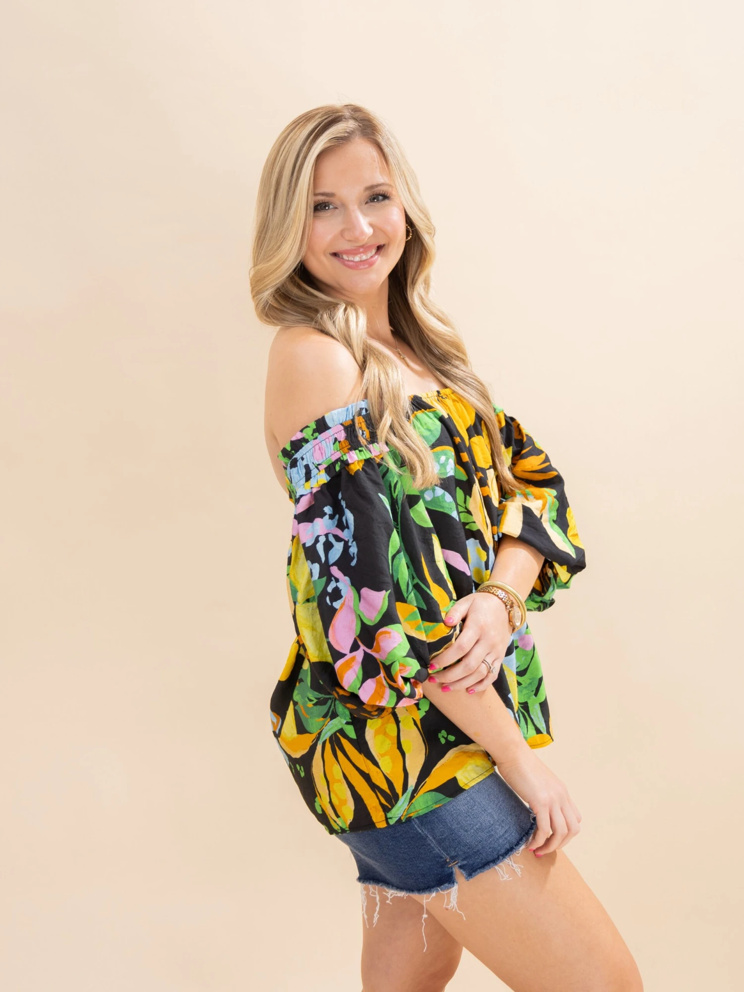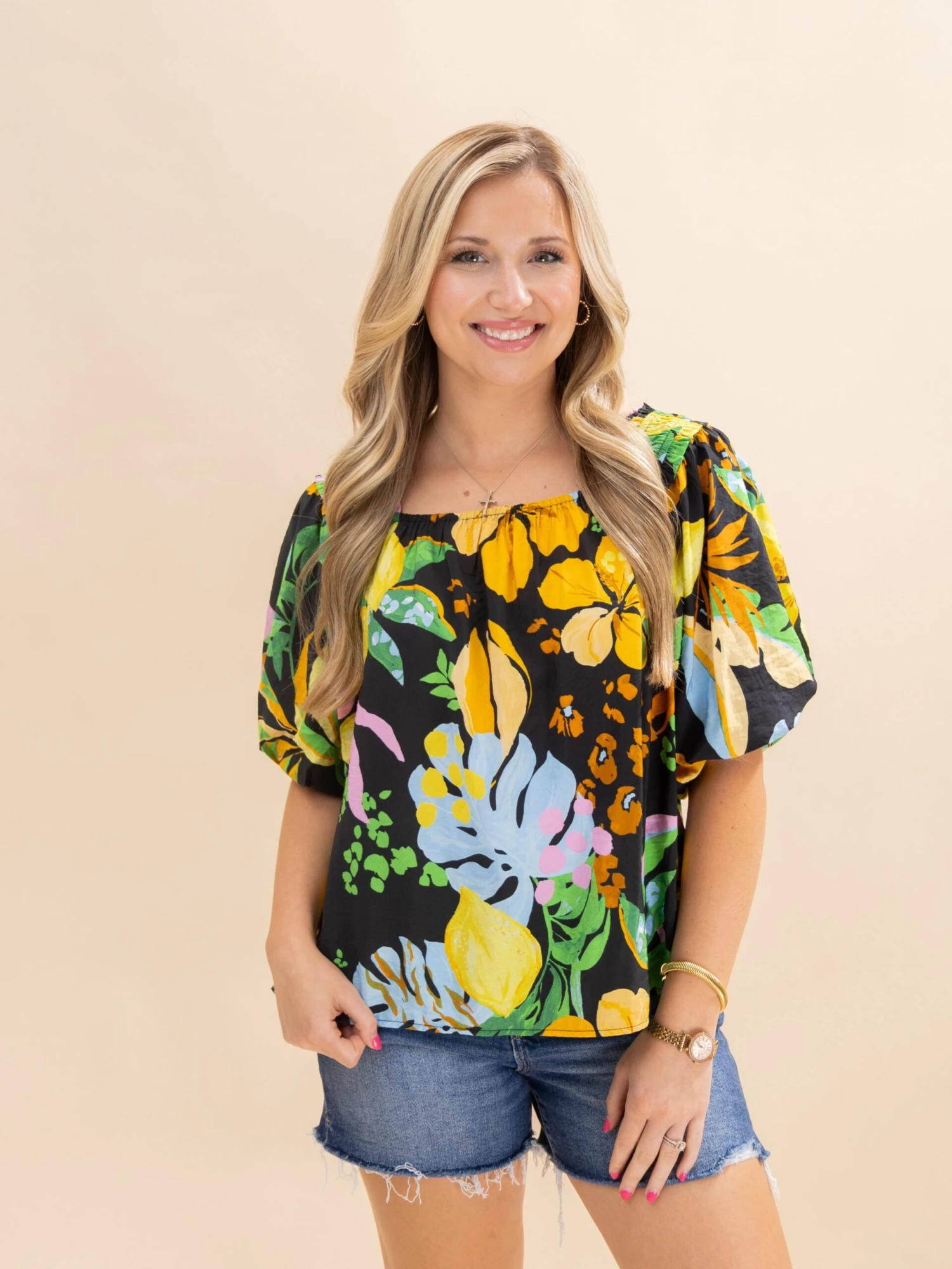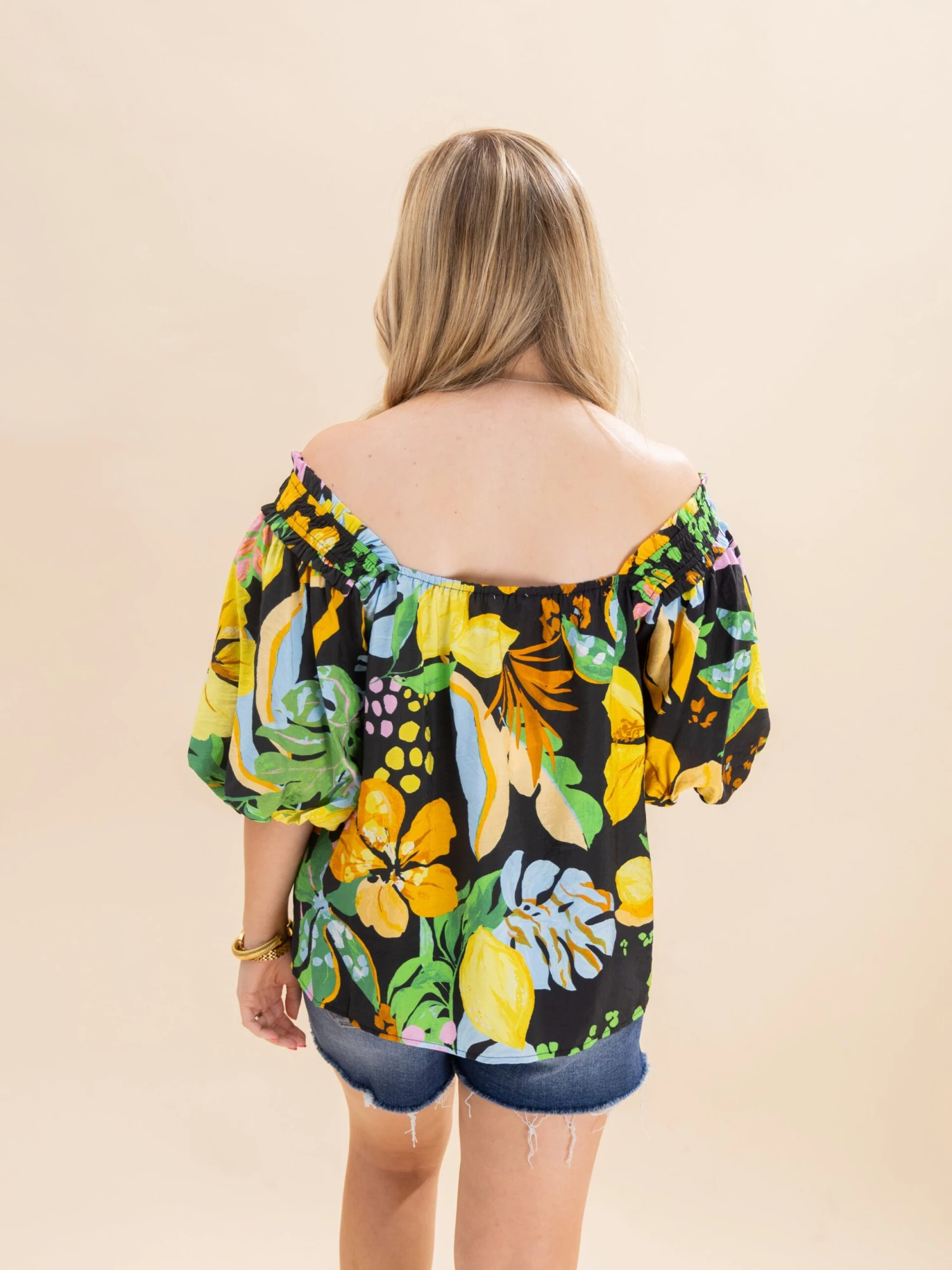 Features: Square Neck, Bubble Sleeves, Tropical Printed Blouse