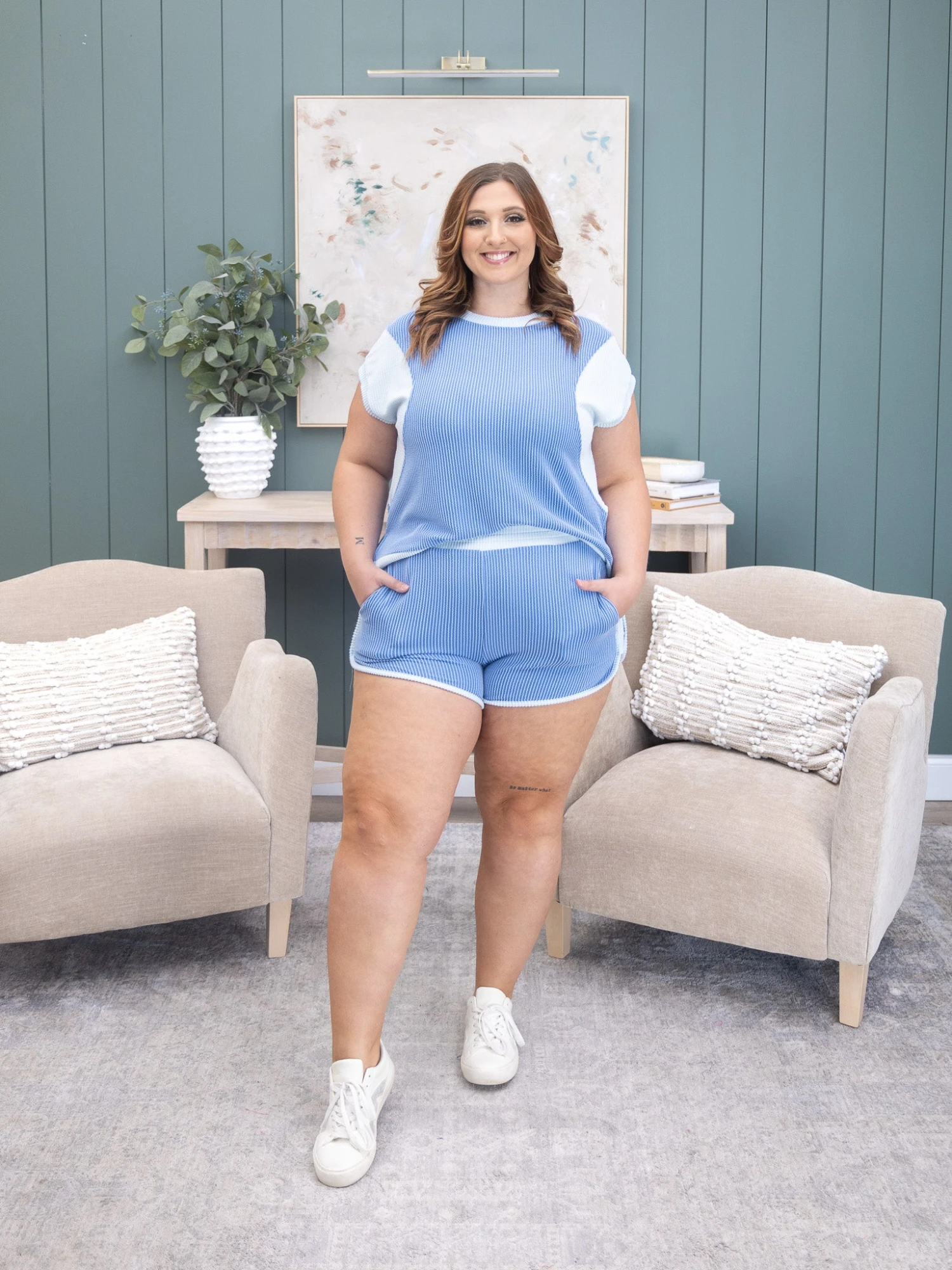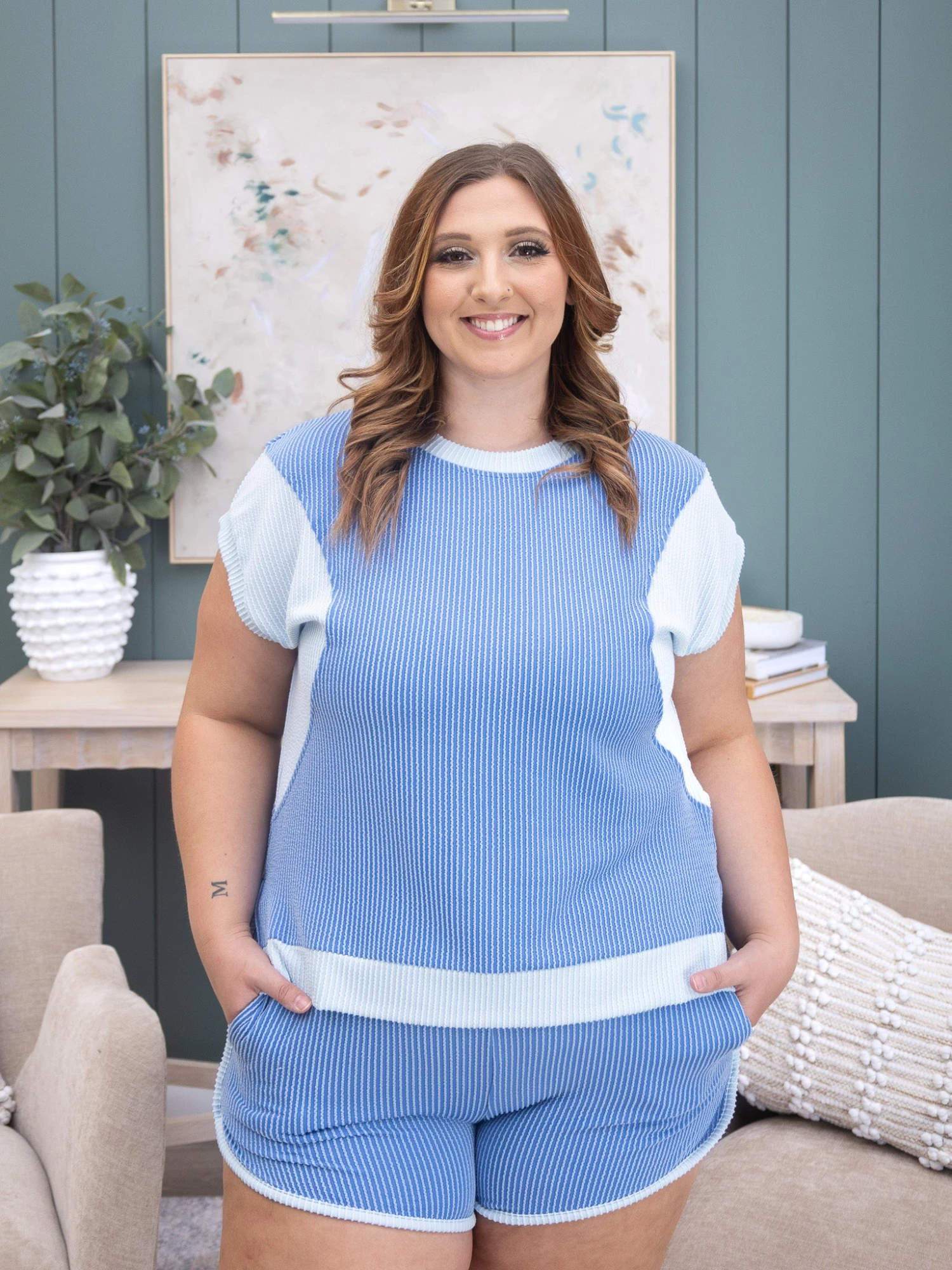 Features: Round Neck, Short Sleeves, Side Slits, Raised Rib, Two Tone Top