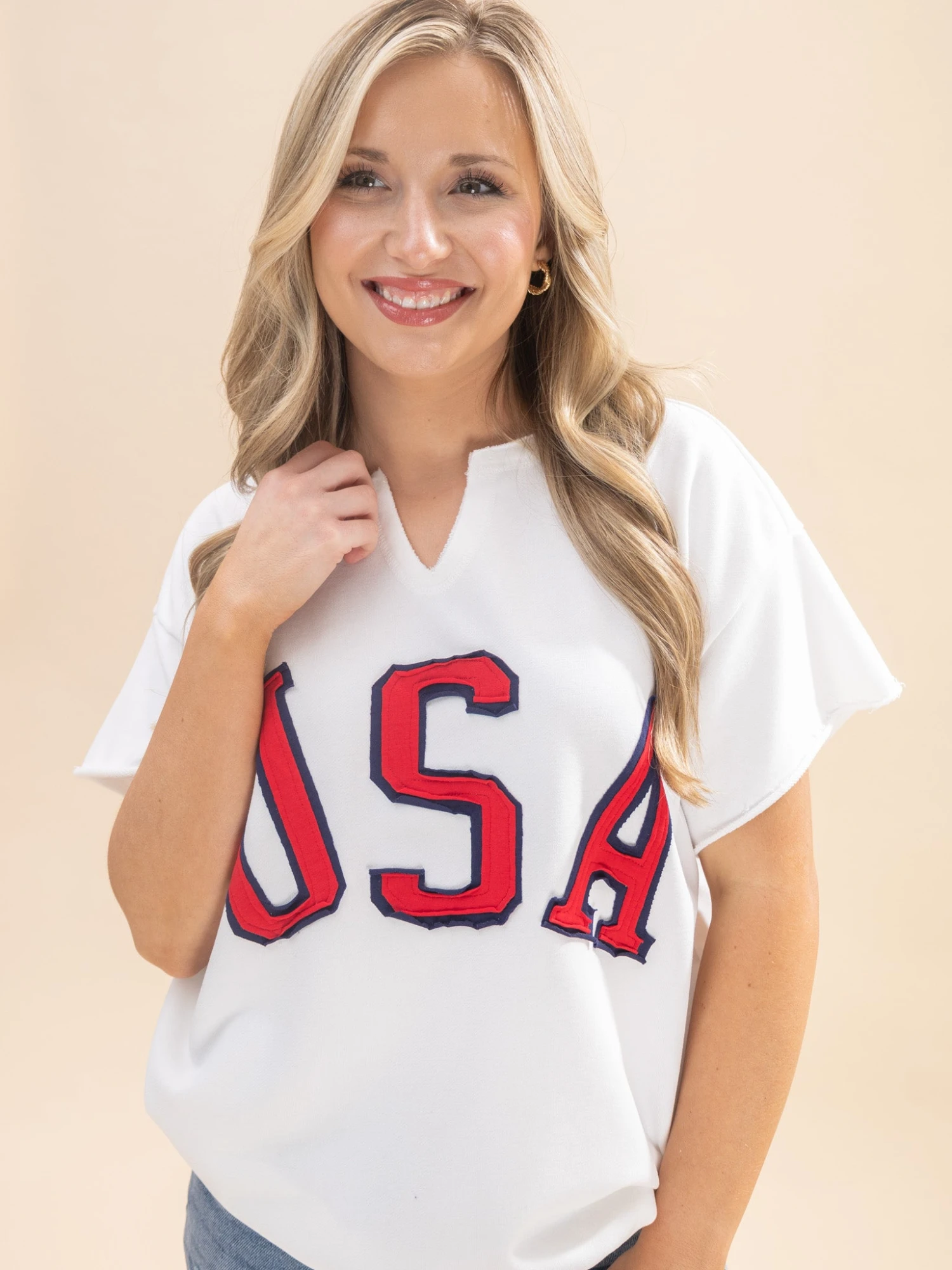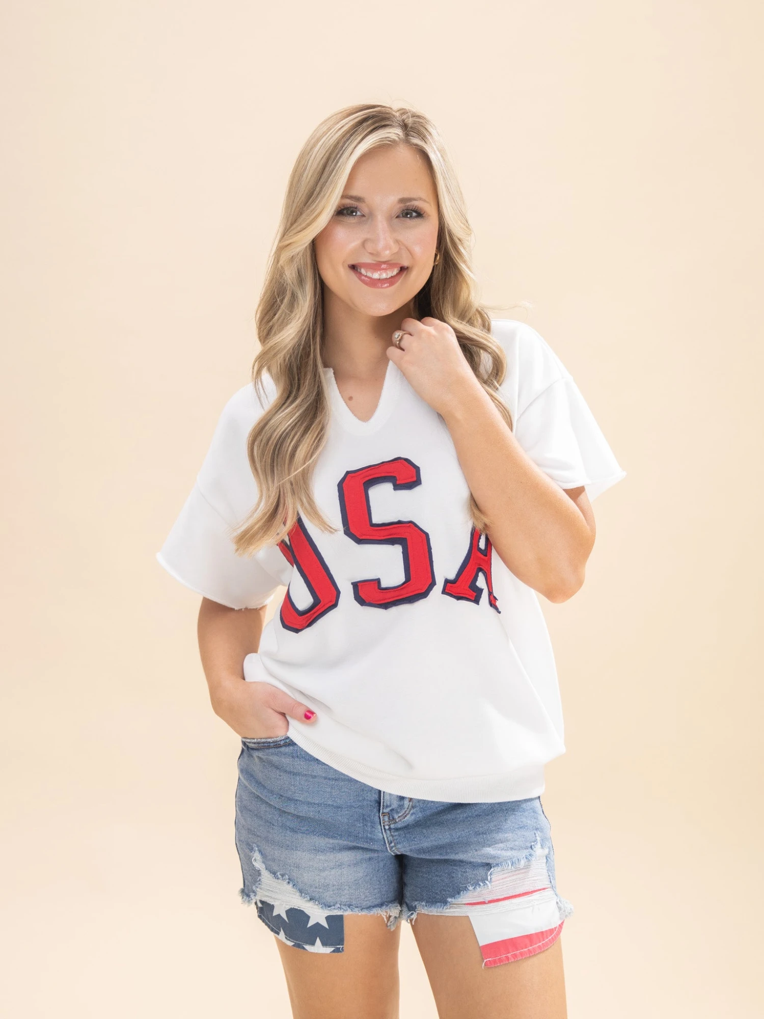 Features: V Neck, Cutoff Short Sleeves, Banded Hem, “USA” Printing