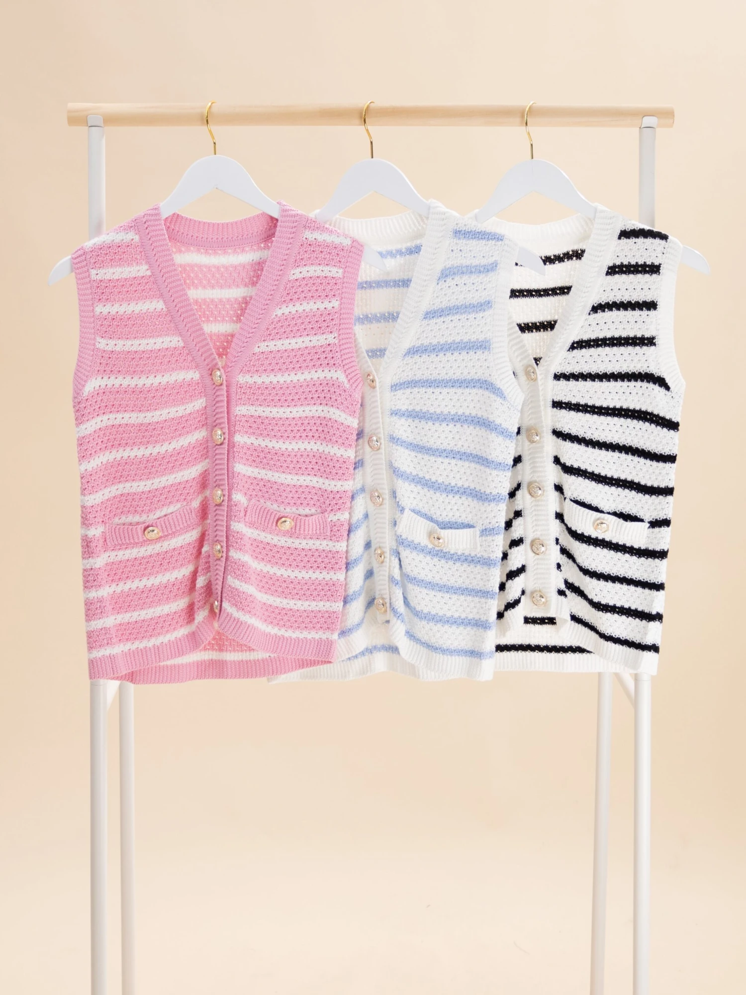 Features: V Neck, Sleeveless, Gold Buttons, Striped