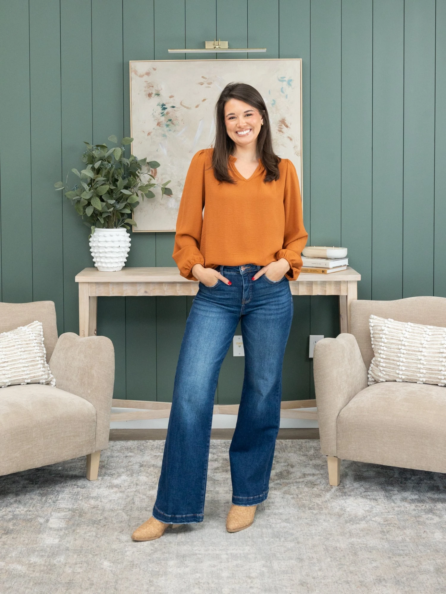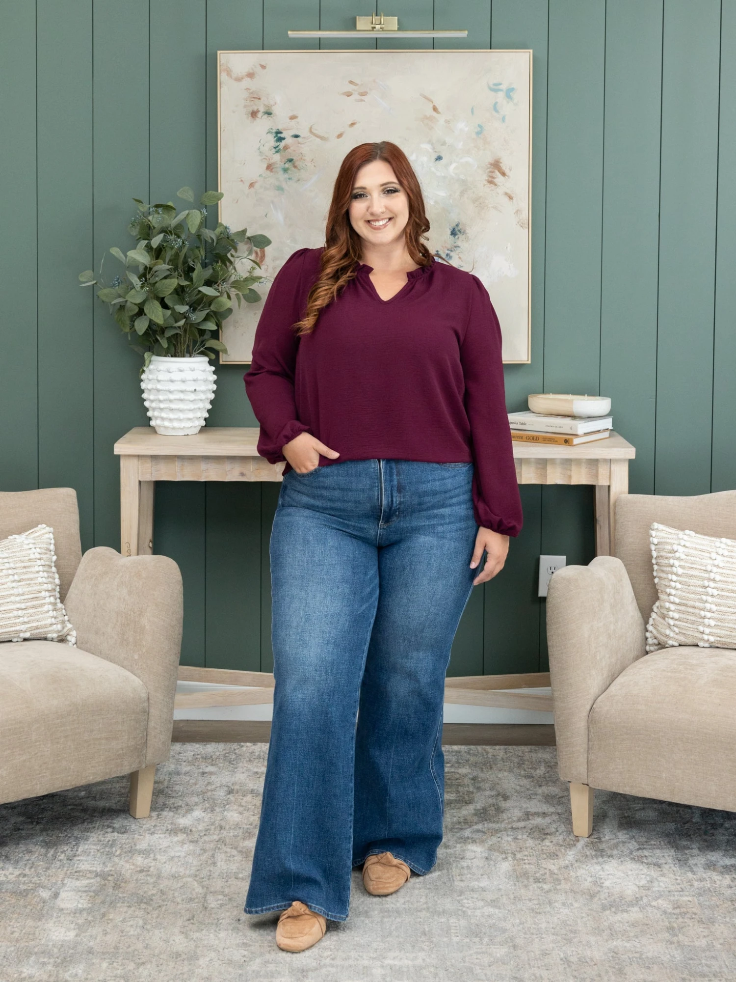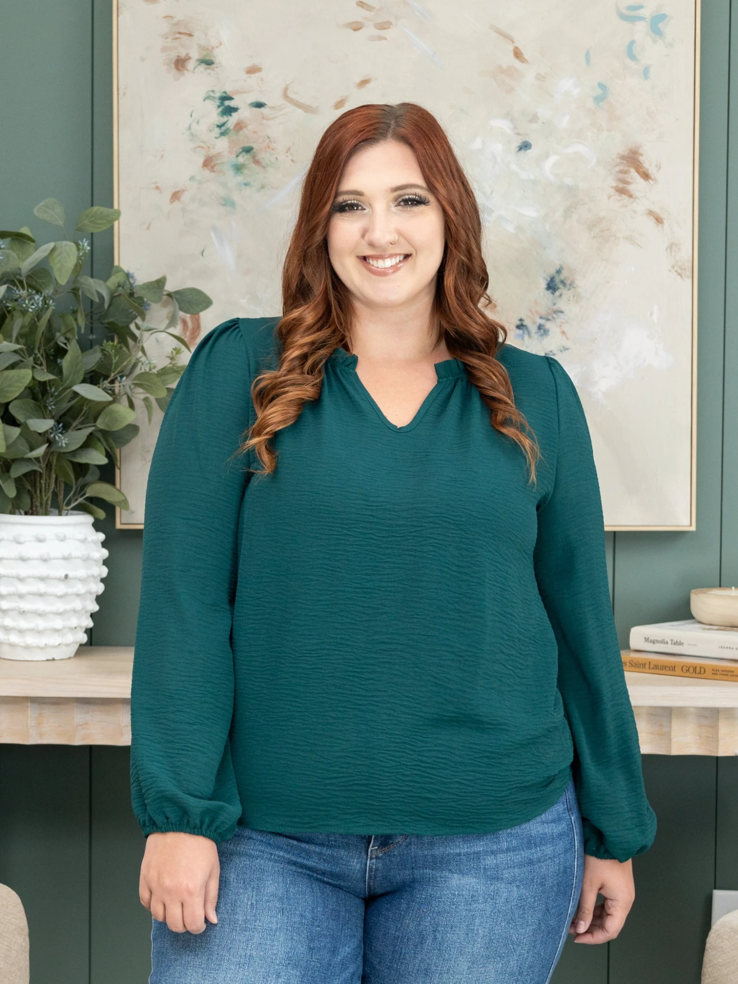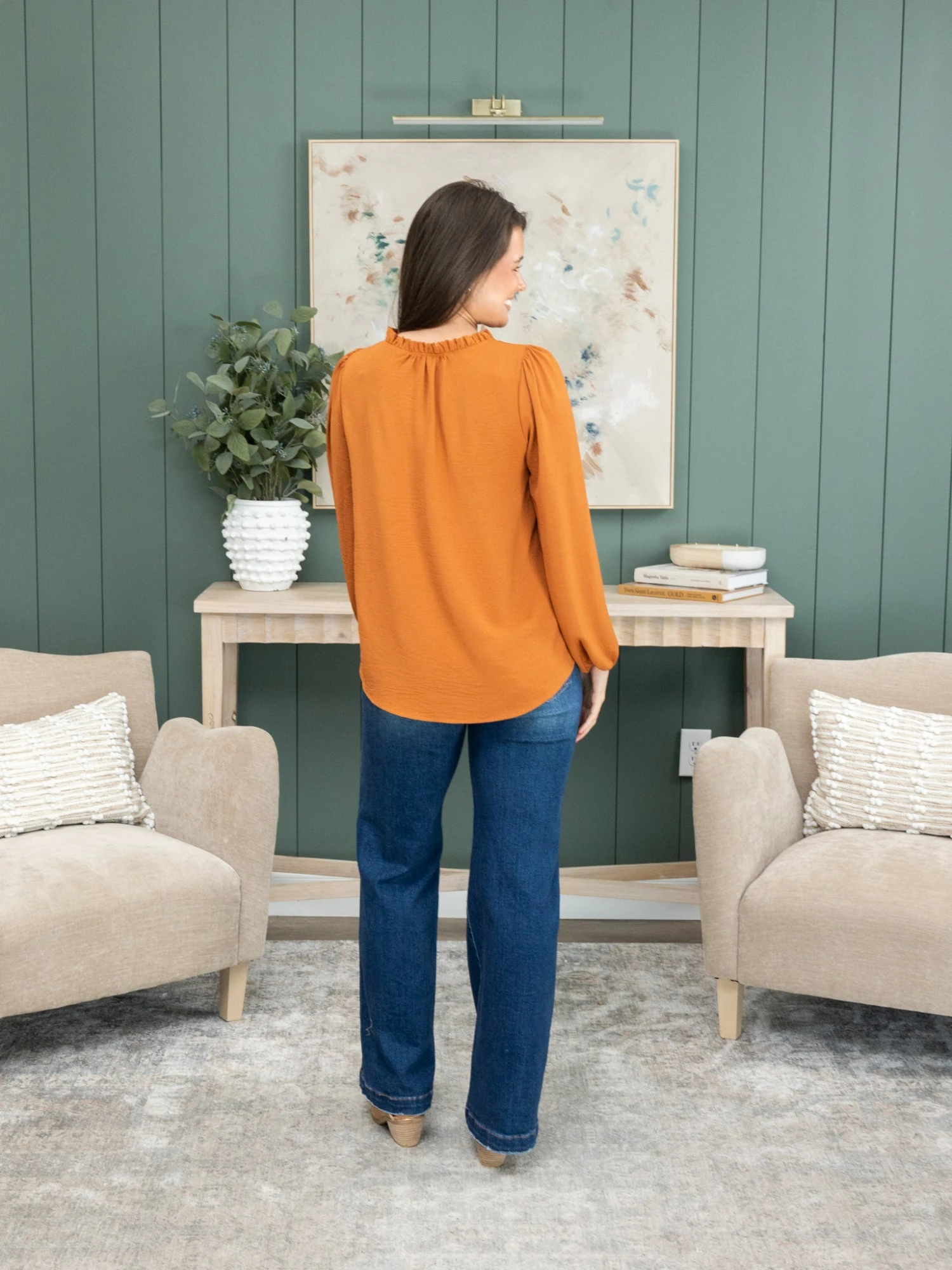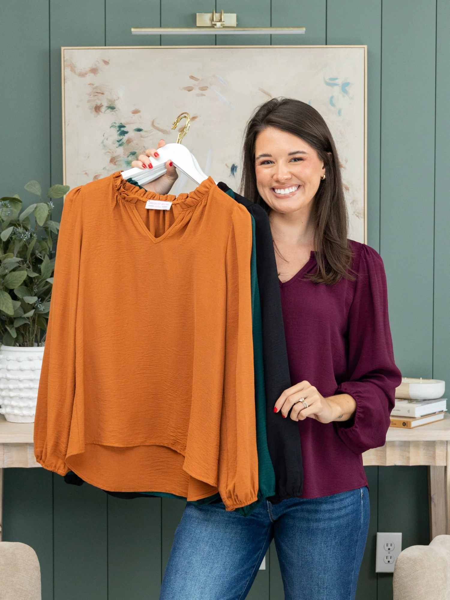 Features: Ruffle Detail V Neck, Long Sleeves, Elastic Cuffs, Hi-Lo Round Hem,Solid Top