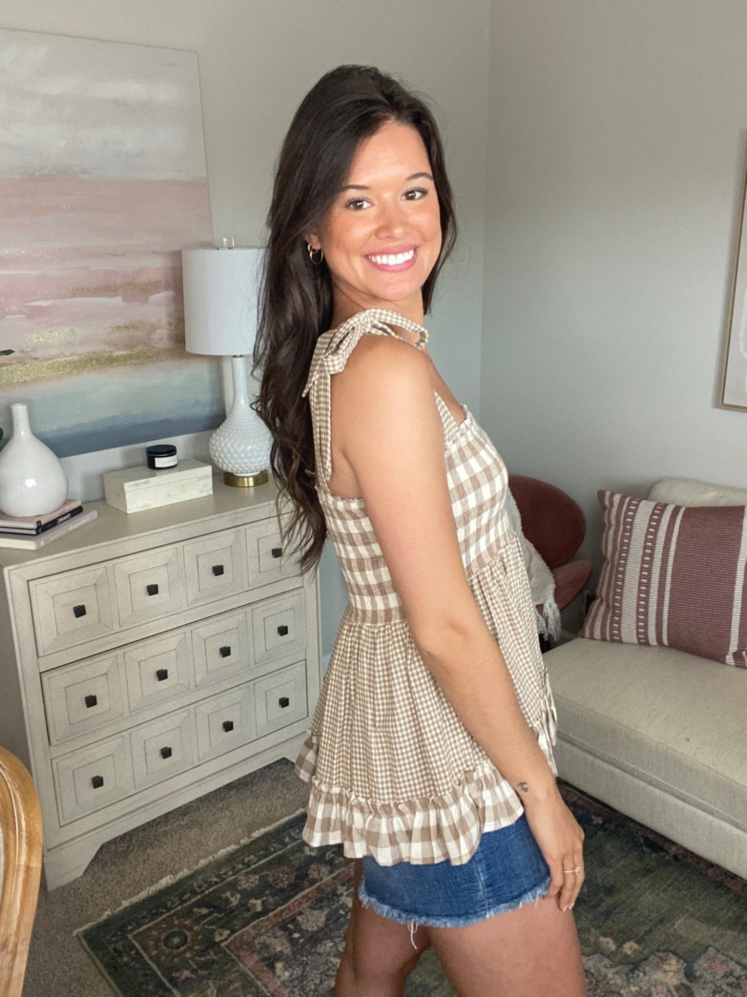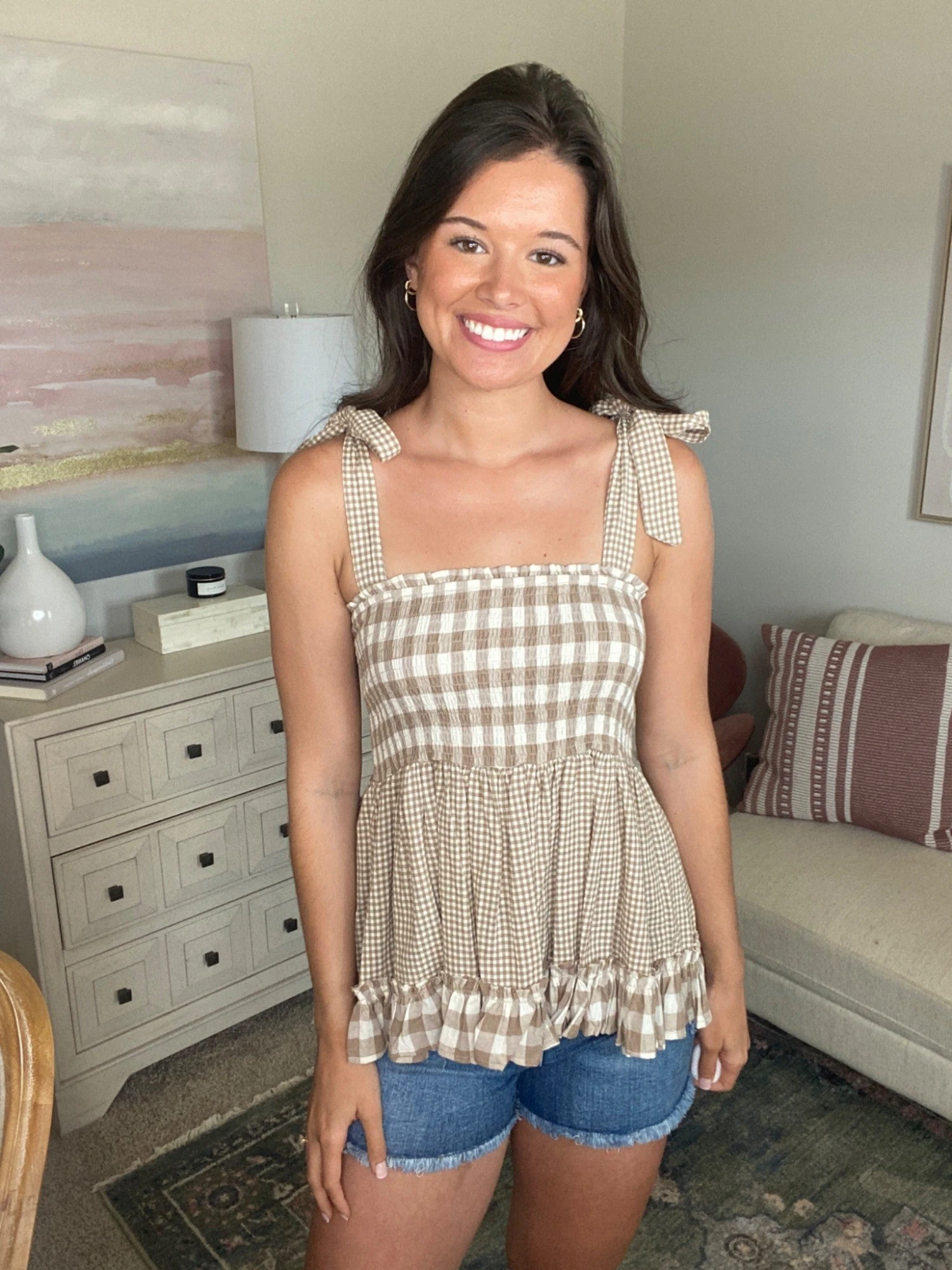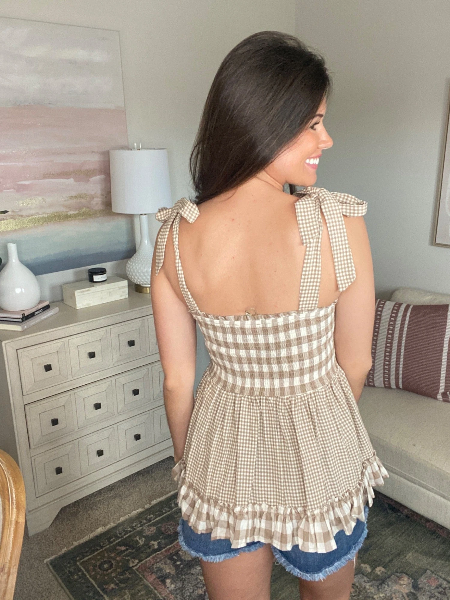 Features: smock top, ruffle hem, shoulder ties