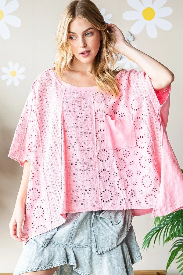 Features: Washed, Asymmetrical Hem, Oversized, Eyelet, Top