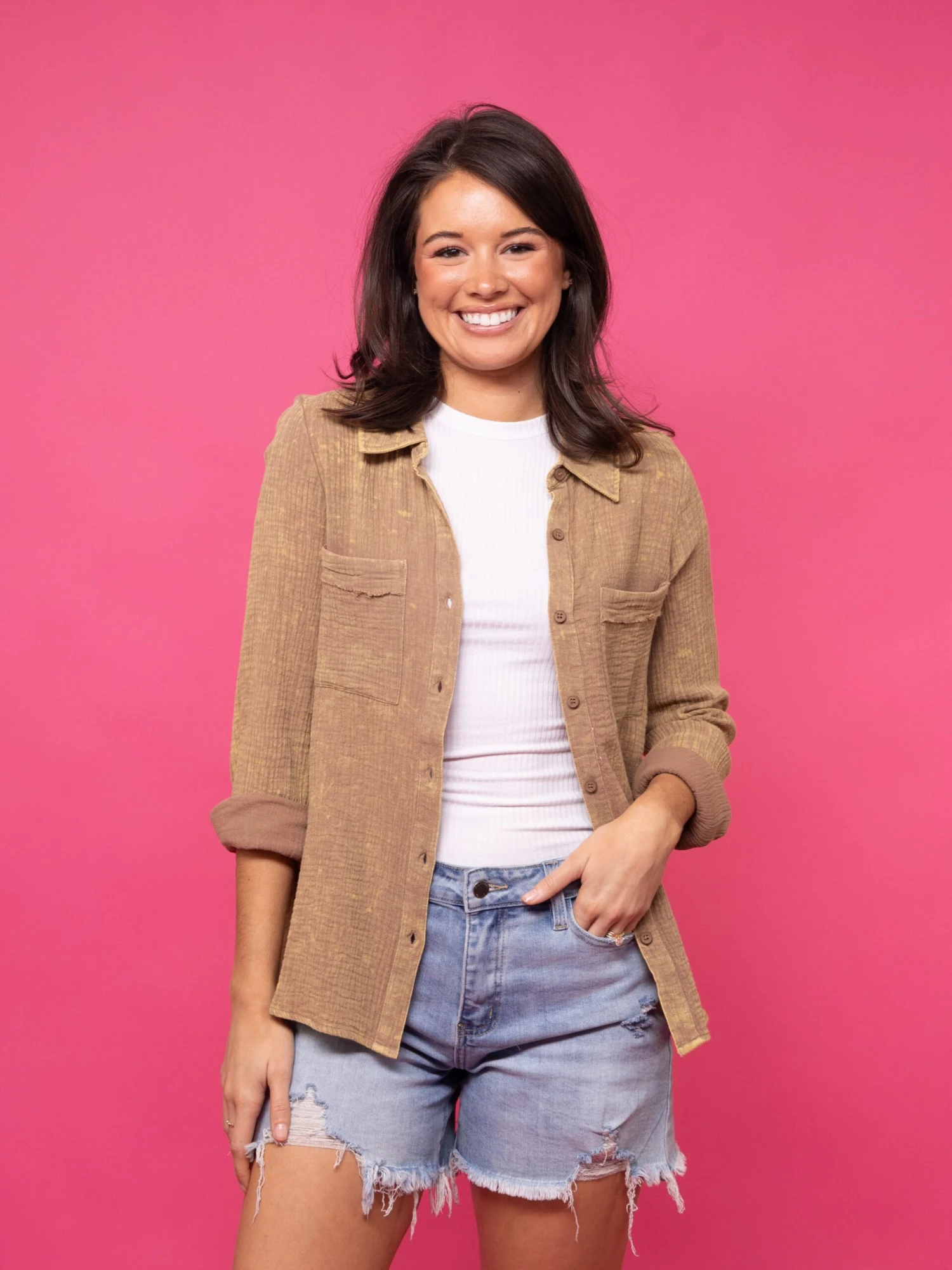 This versatile top features a relaxed fit and a crinkle gauze texture for a breezy and casual look! And the summary-down front makes it perfect for so many occasions!