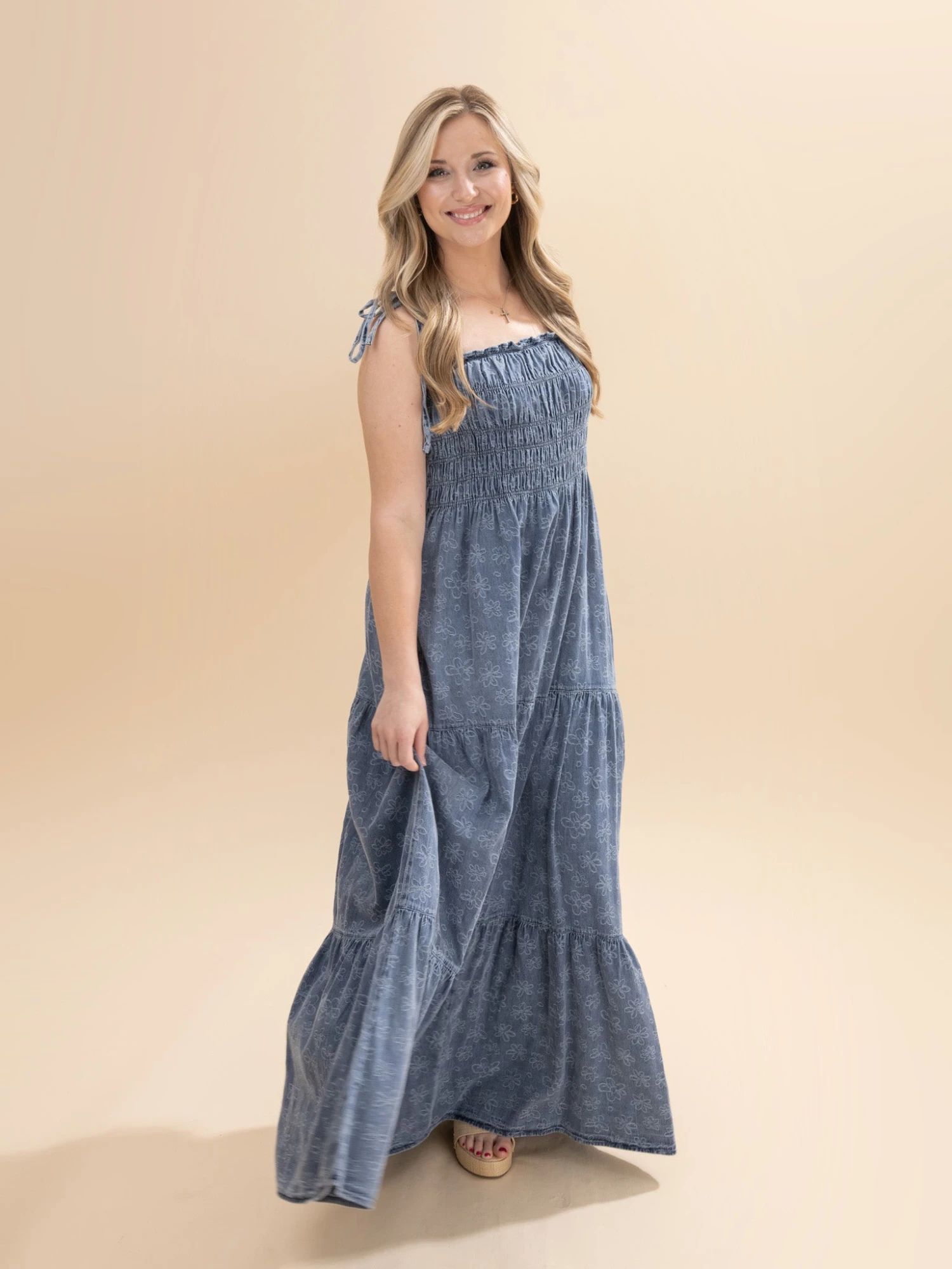Features: Tie Spaghetti Straps, Smocked Body, Pockets, Daisy Printed Pattern, Tiered Denim Maxi Dress