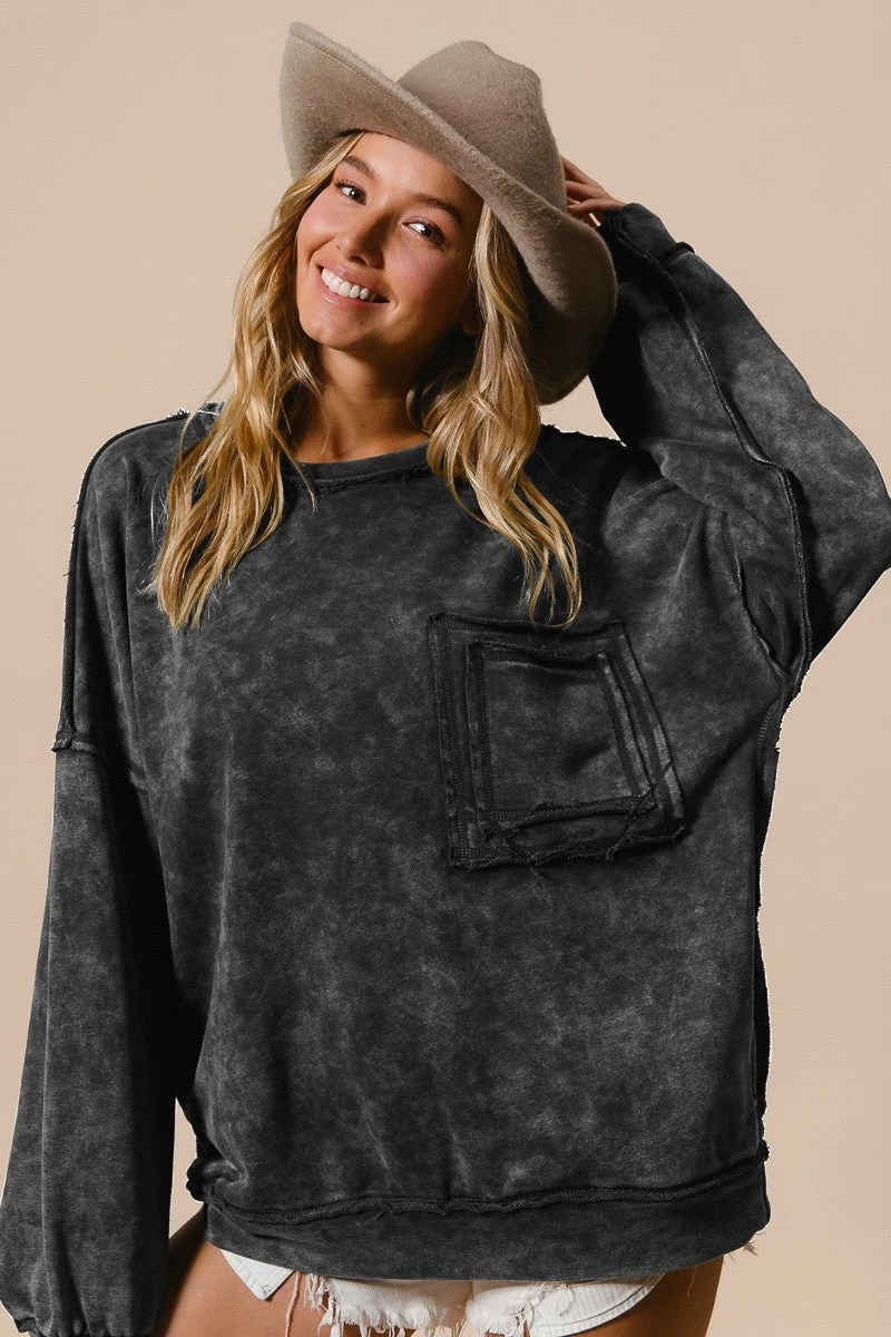 Features: Washed Terry, Cut Edge Detail Pocket, Top