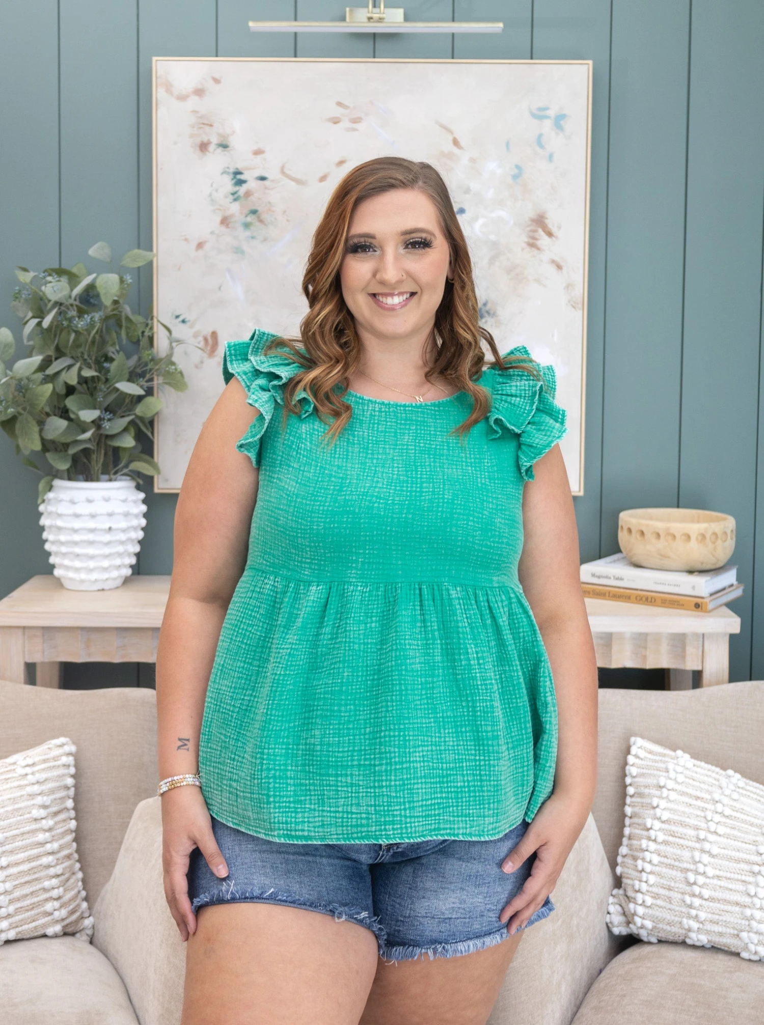 Features: Double Gauze, Acid Washed, Short Ruffle Sleeve, Peplum, Round Neck