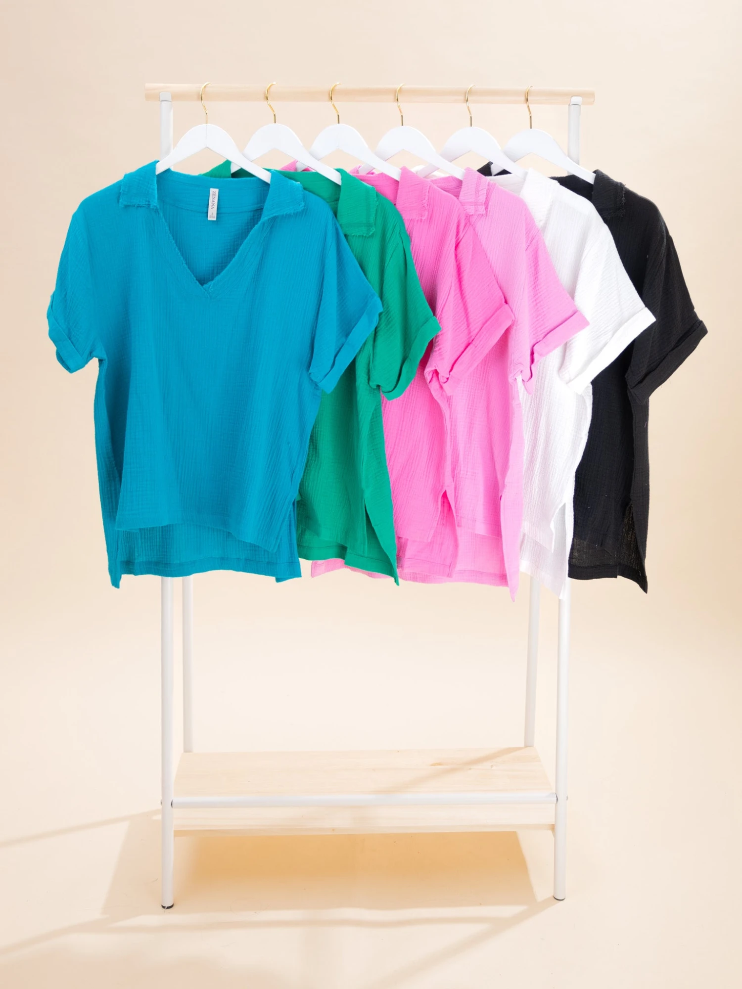 Features: Collar, V Neck, Rolled Short Sleeve, Hi-Lo Boxy Hem, Side Slits, Double Gauze Top