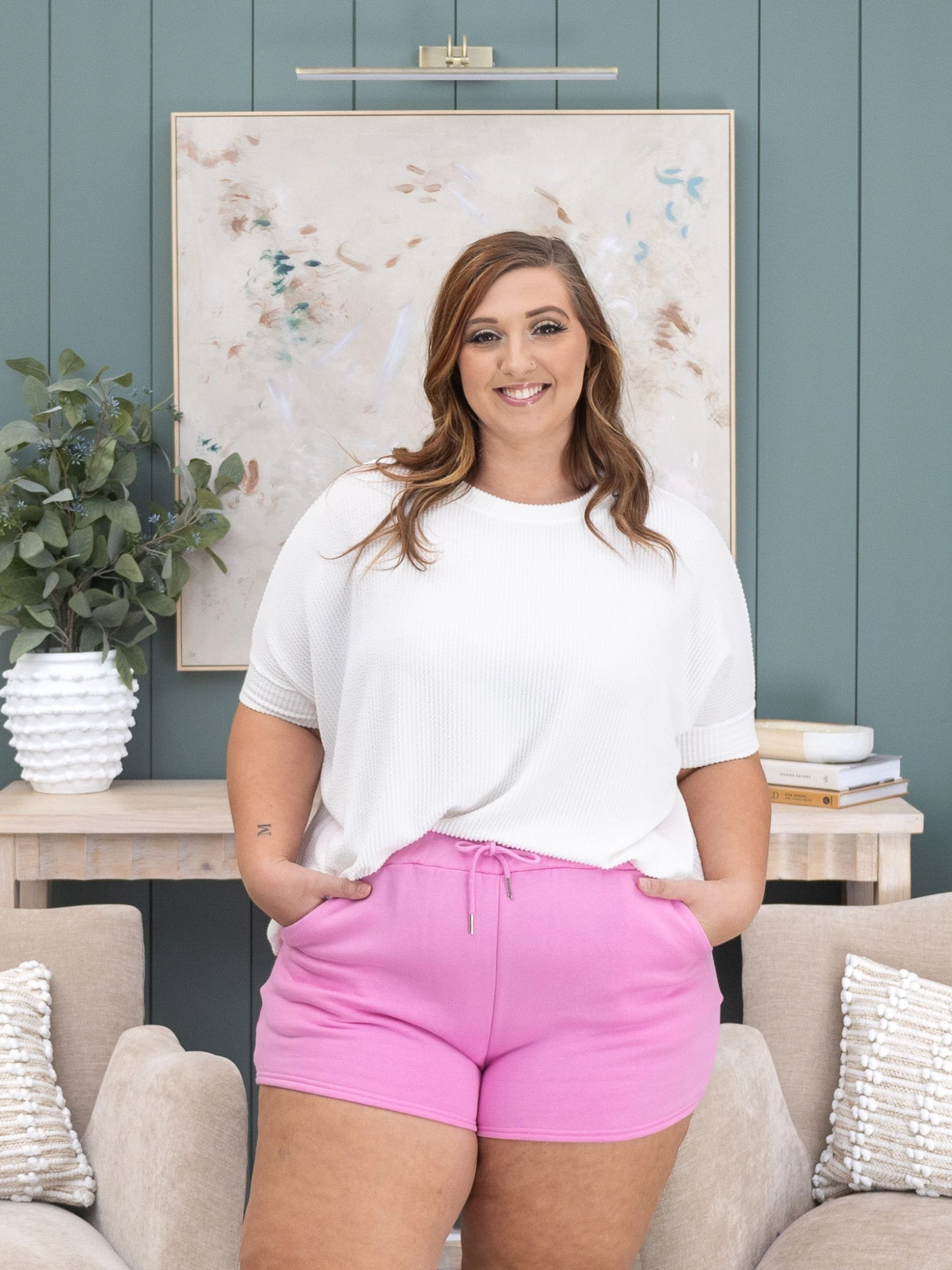 Crimsen (long blonde hair) is 5’1, 34B bra, typically wears size S in tops and 3 in denim. Wearing size S