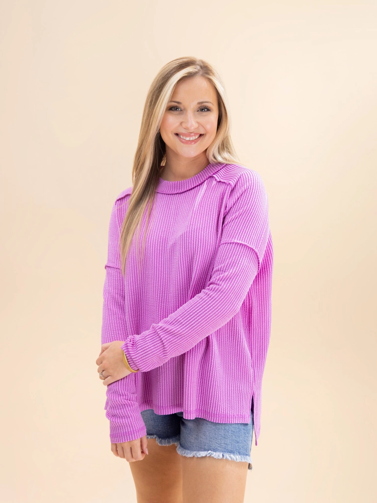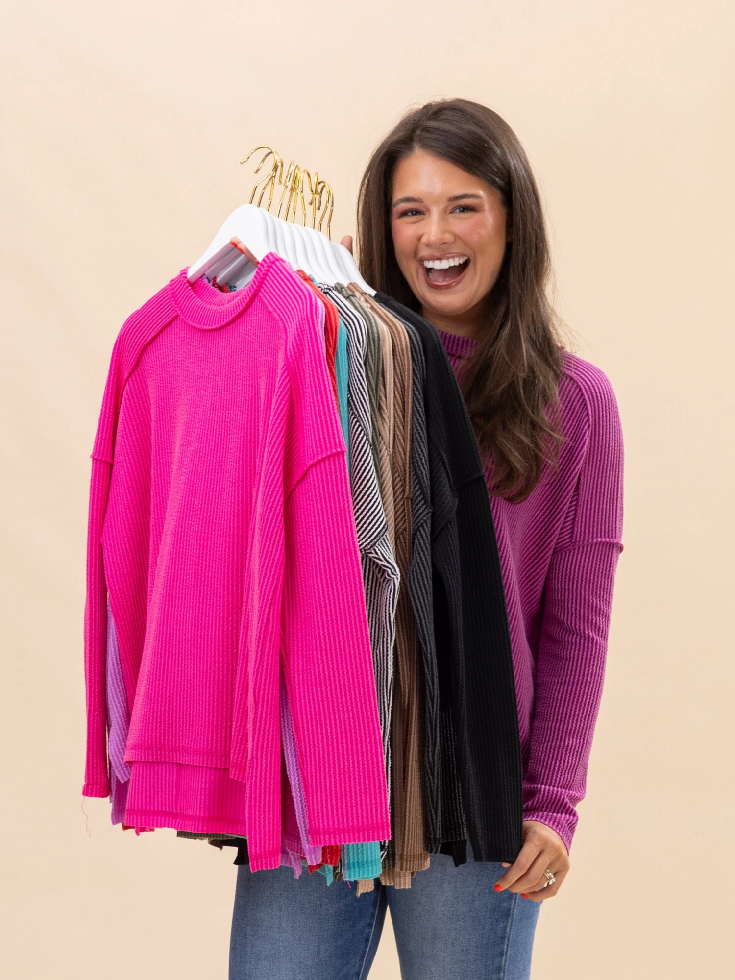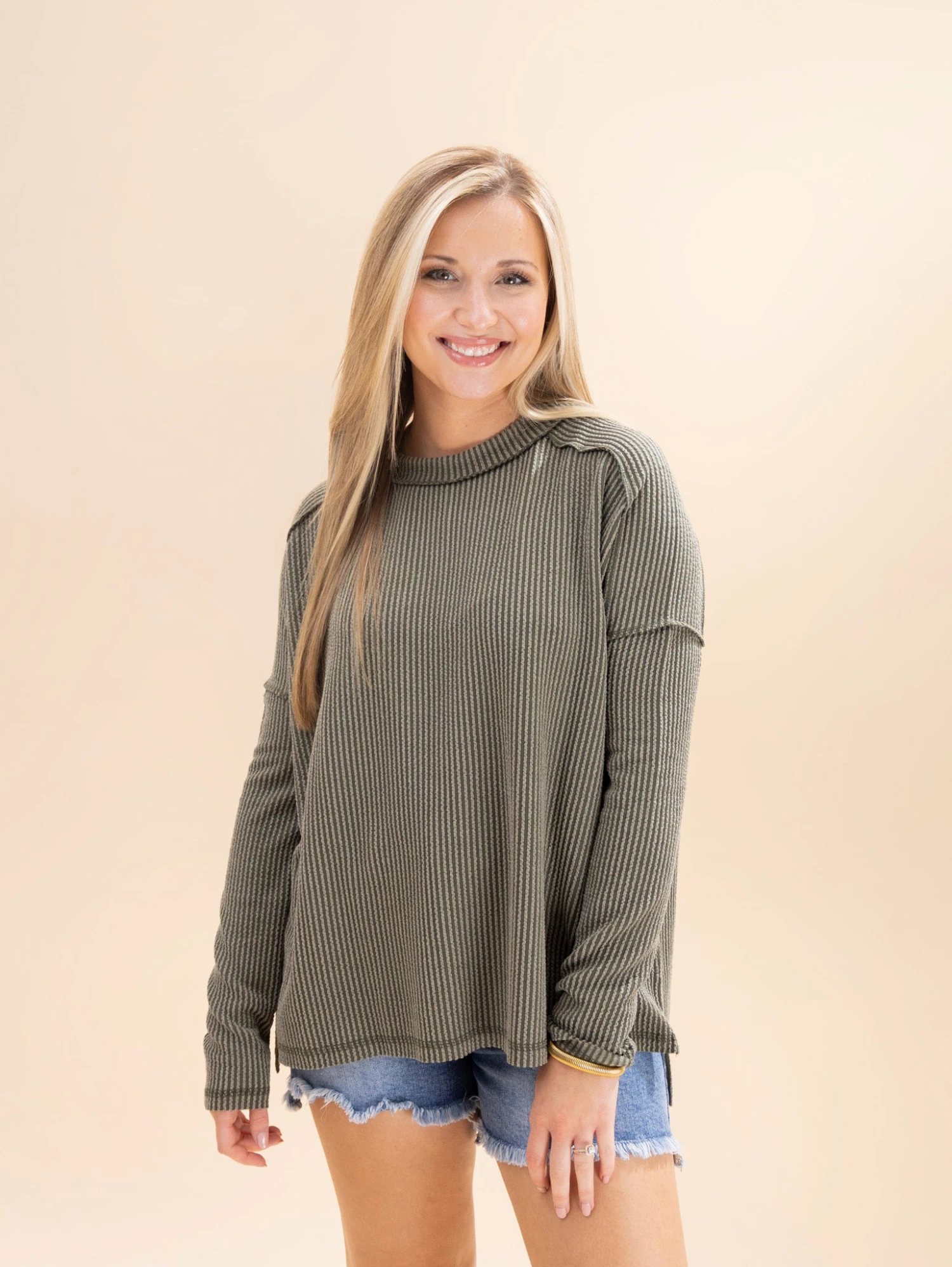 Features: Raised Rib, Boat Neck, Long Sleeve, Exposed Seams