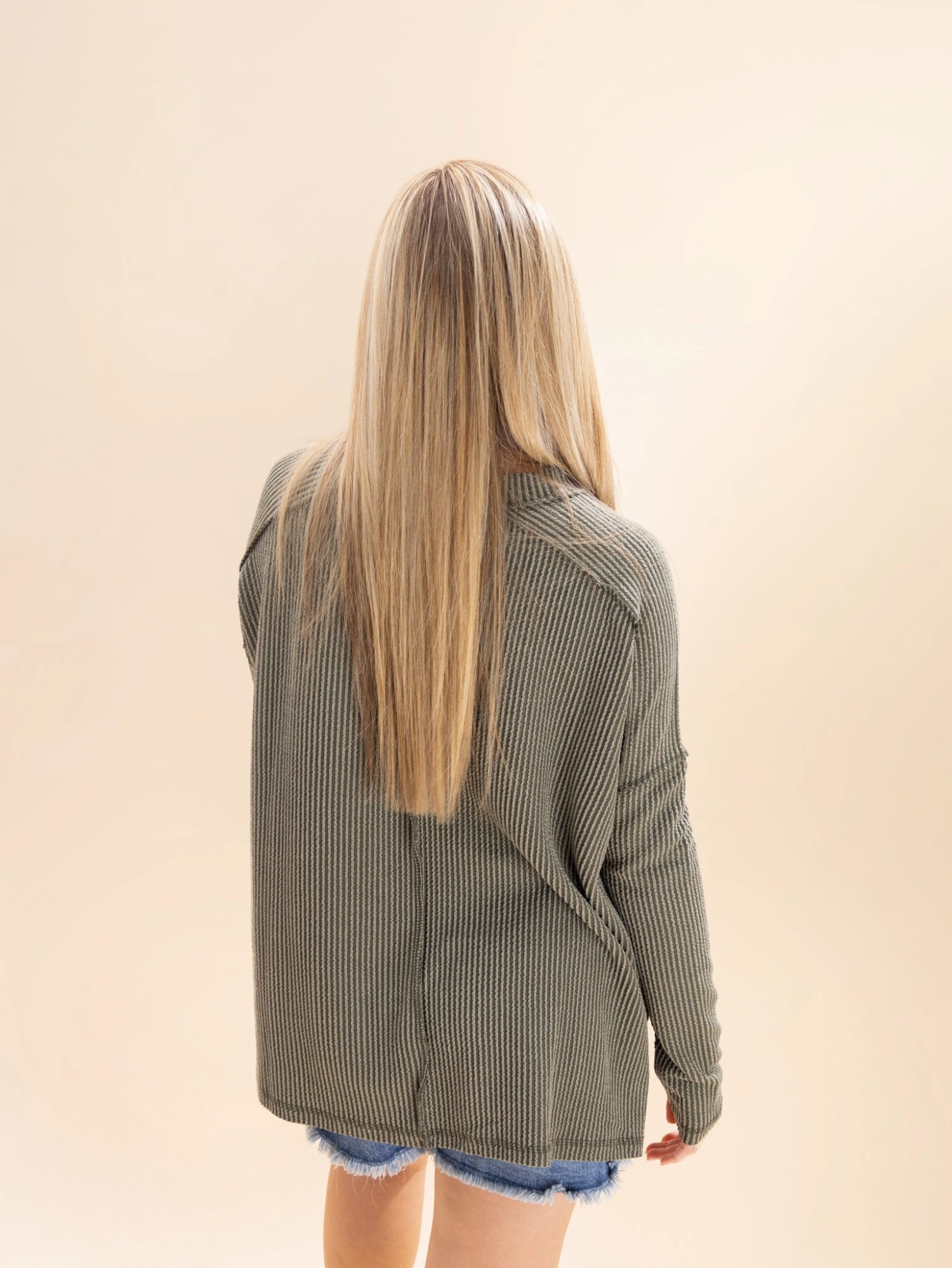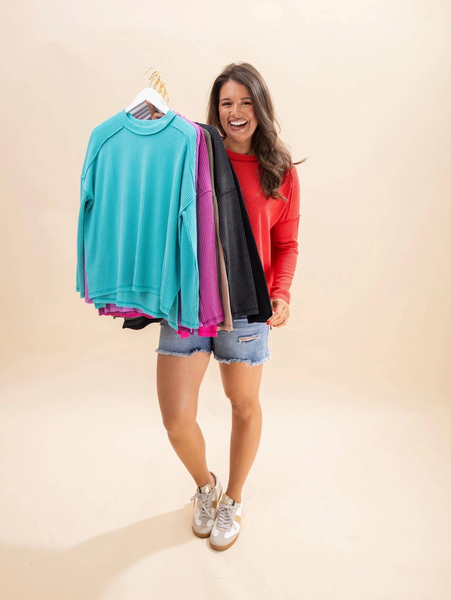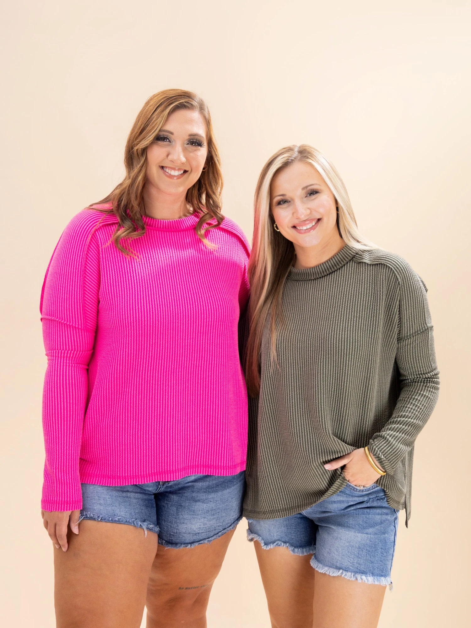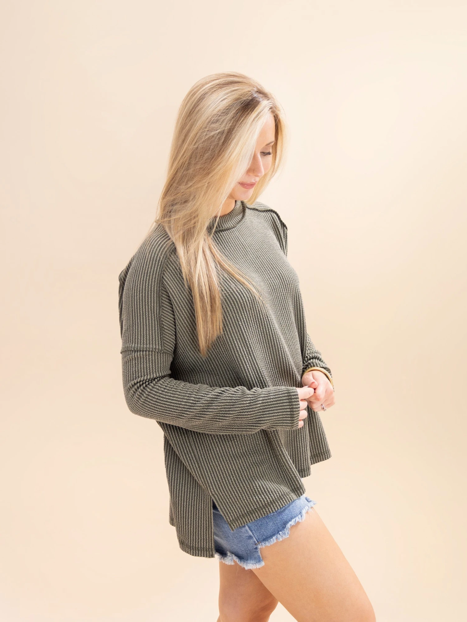 Features: Raised Rib, Boat Neck, Long Sleeve, Exposed Seams