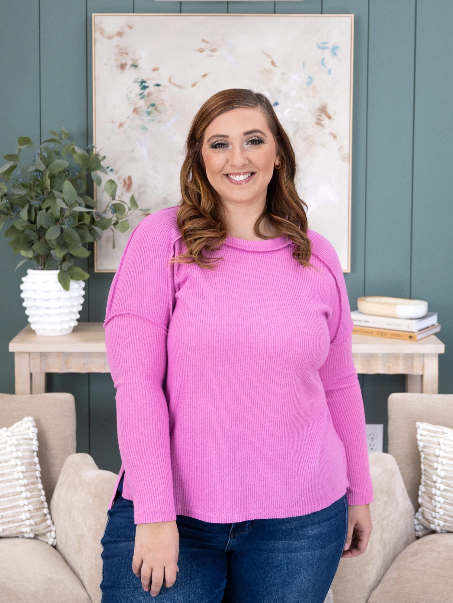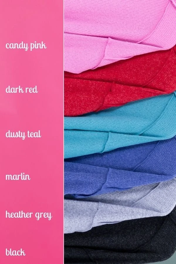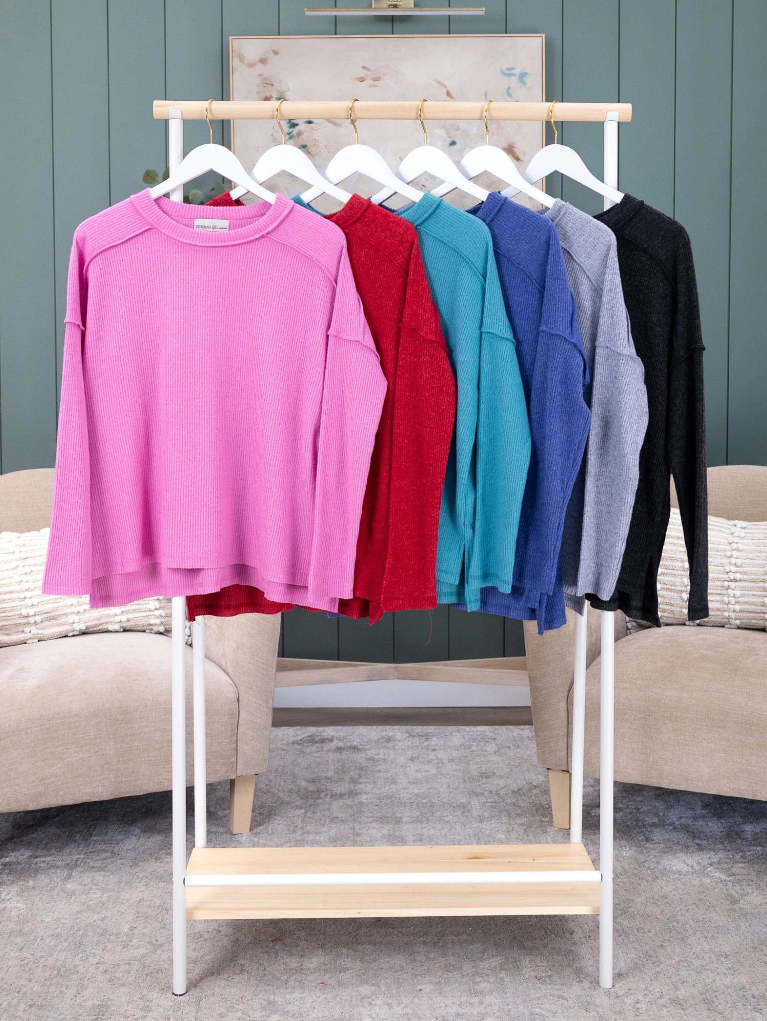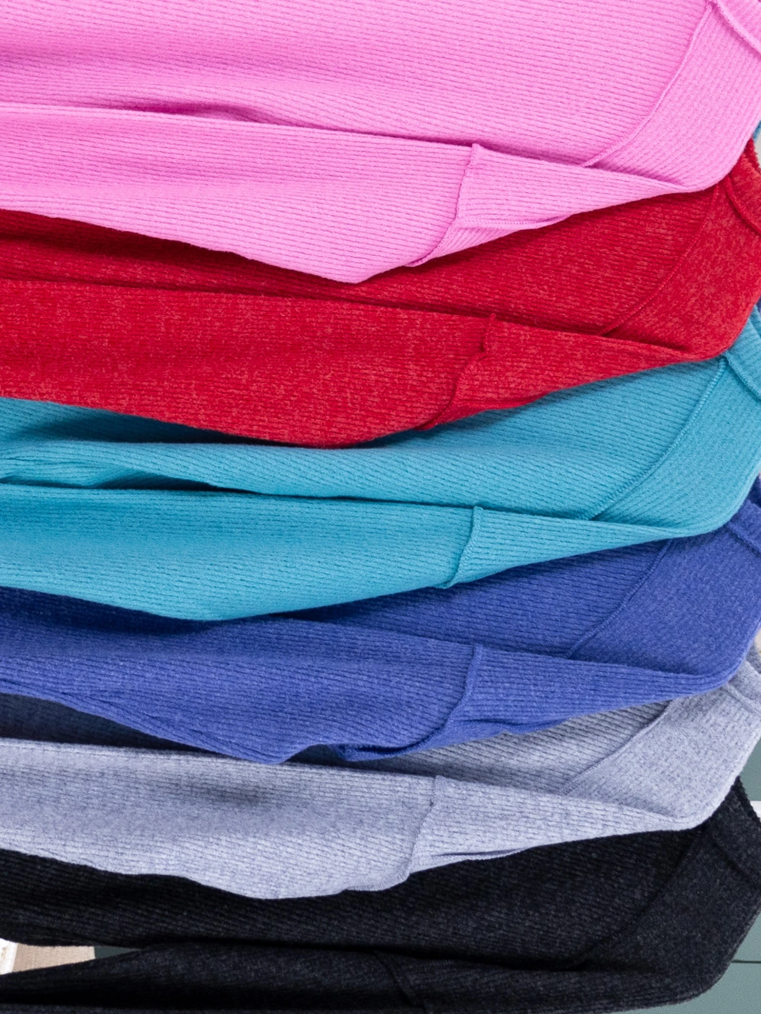 Features: Round Neck, Long Sleeves, Side Slit, Hi-Lo Hem, Ribbed, Hacci