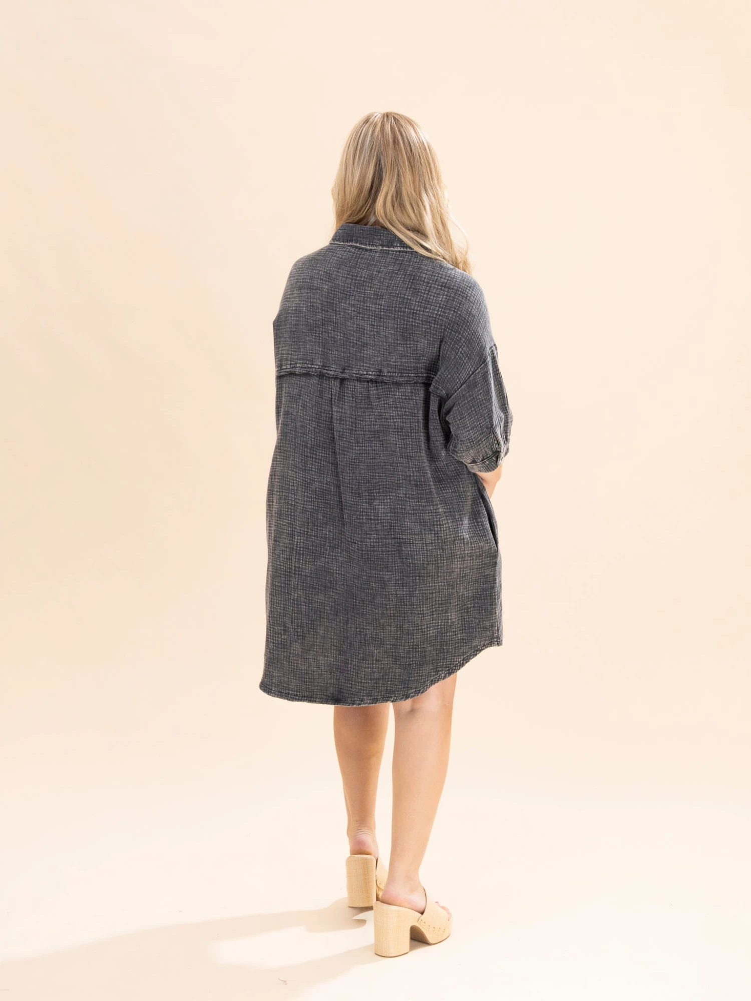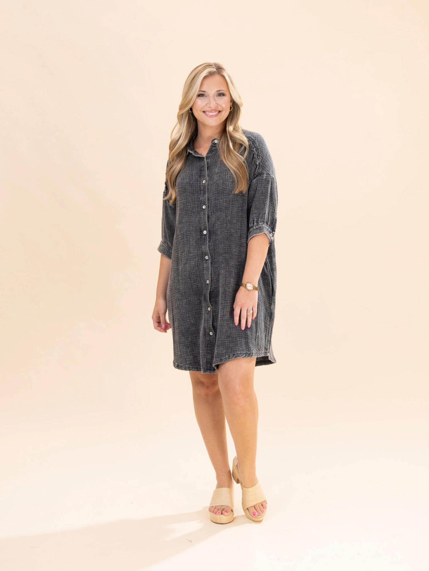 Crimsen (long blonde hair) is 5’1, 34B bra, typically wears size S in tops and 3 in denim. Wearing size S