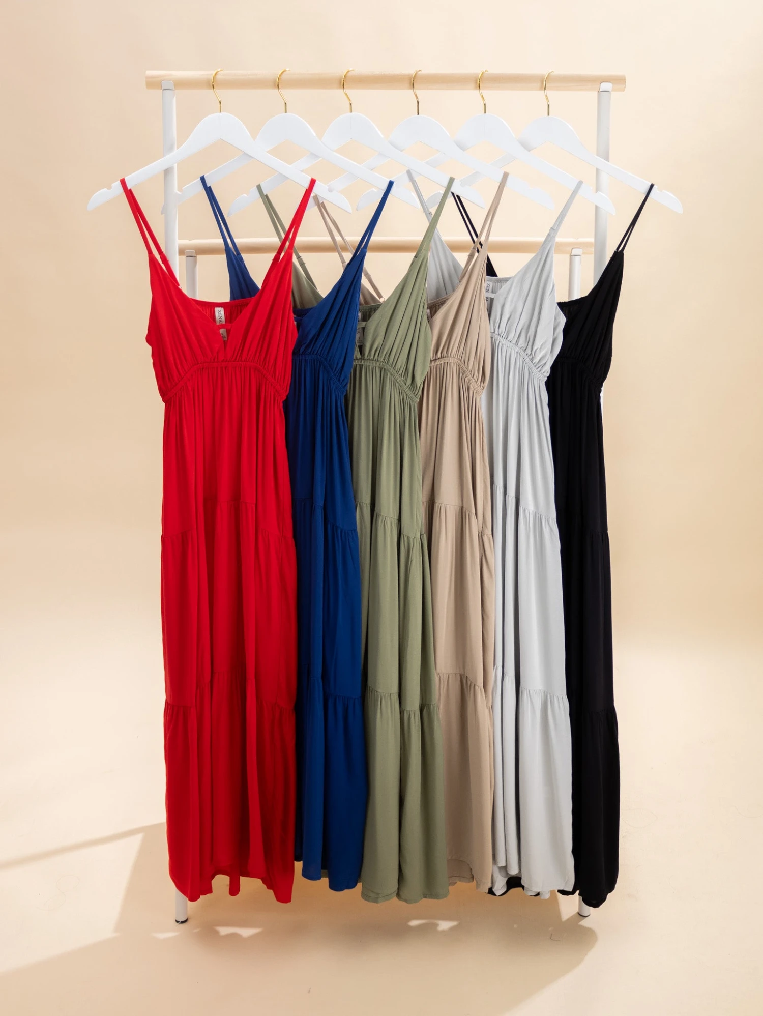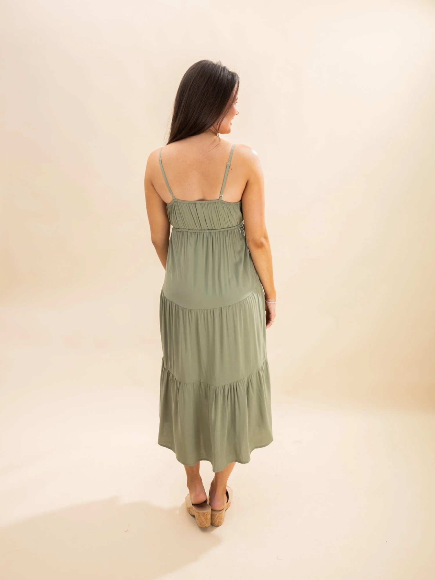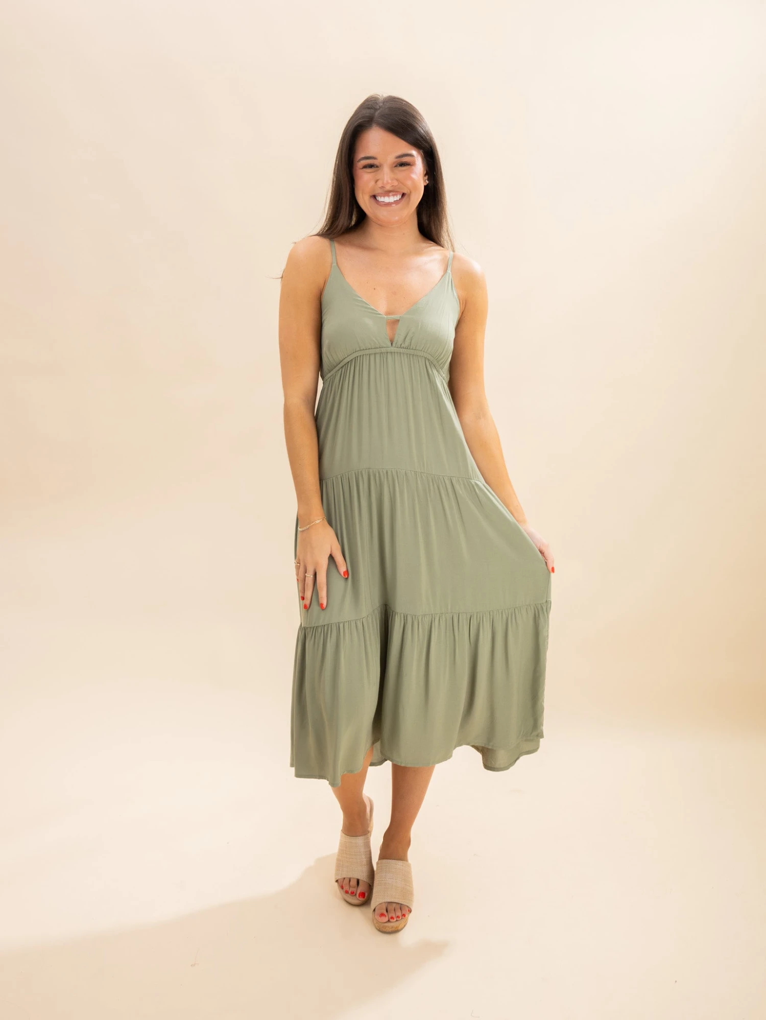 Features: Deep V Neck, Adjustable Spaghetti Straps, No Pockets, Empire Elastic Waist, Tiered